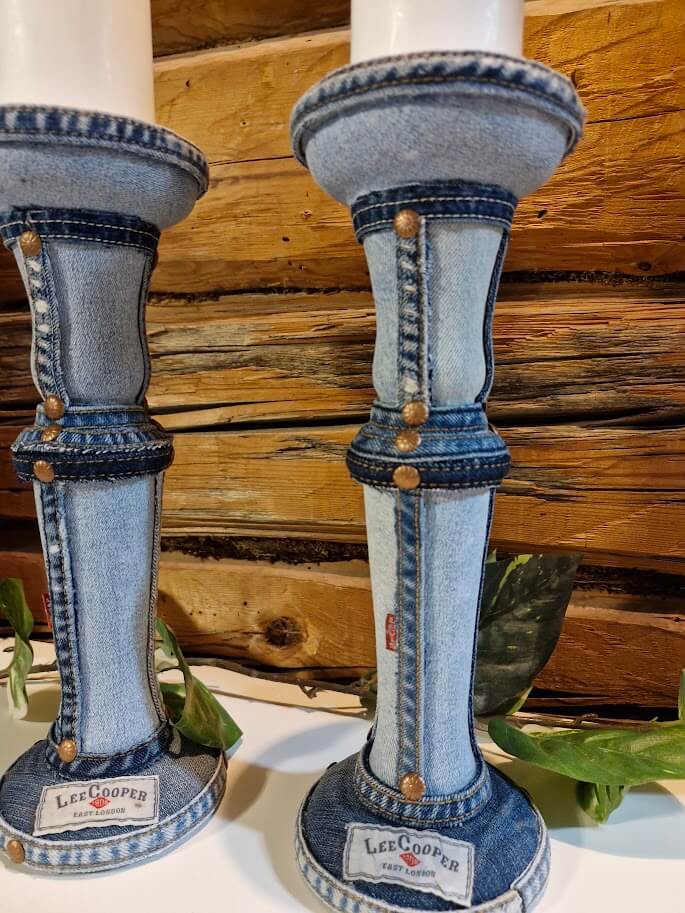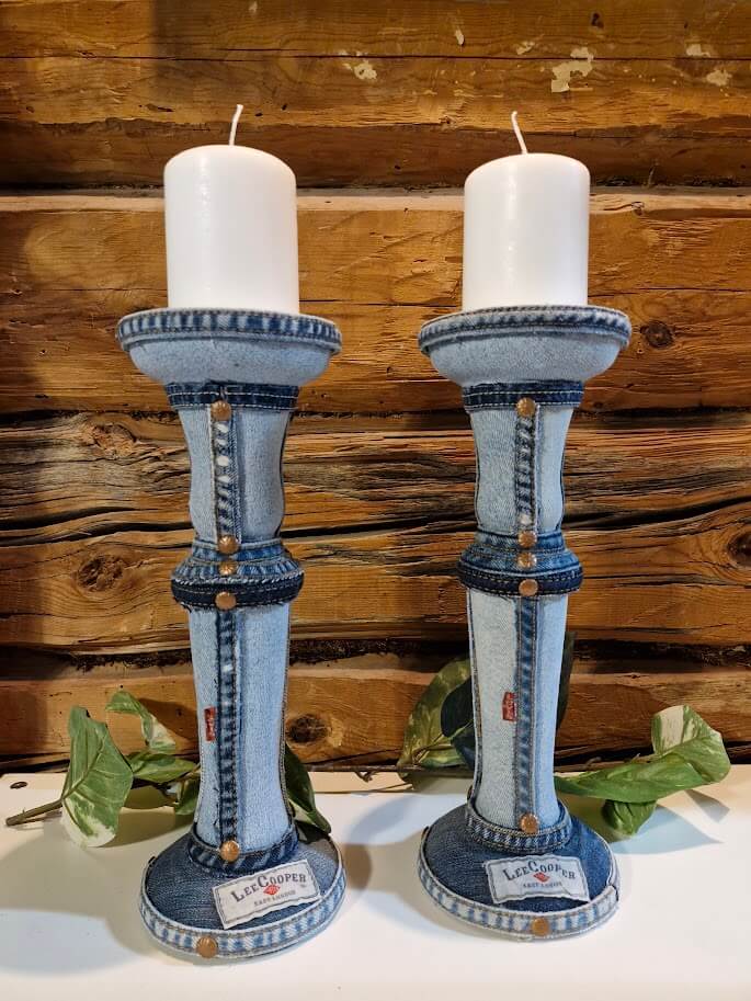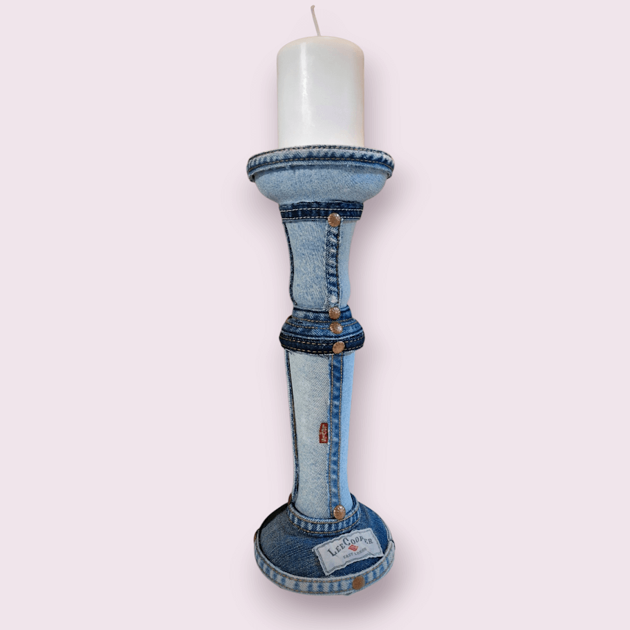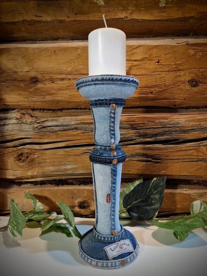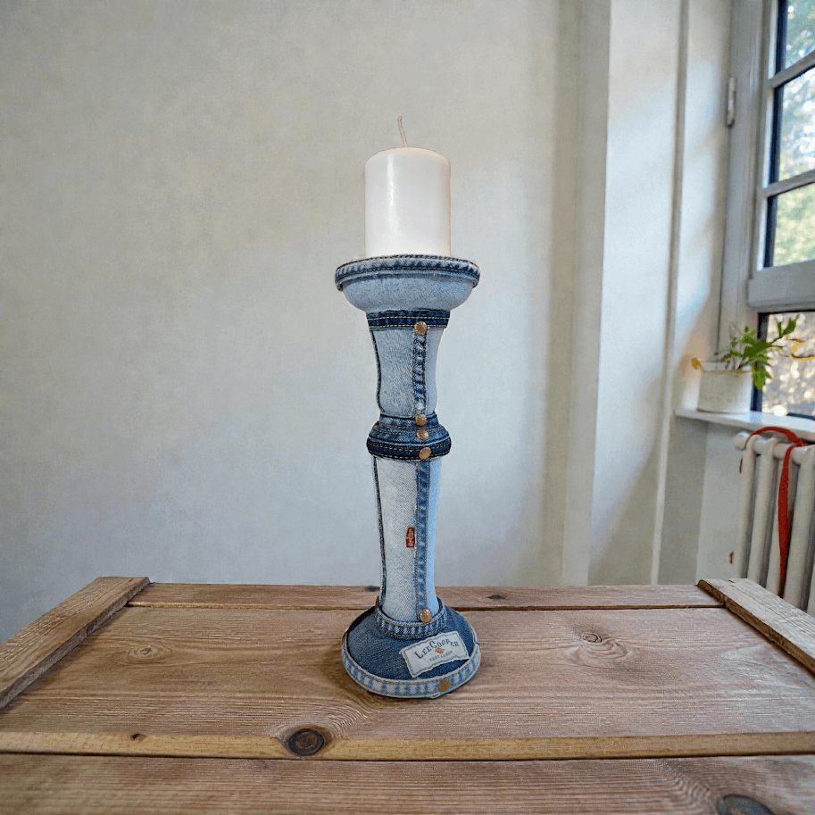Todella persoonallinen, farkulla verhoiltu kynttilänjalka reippaalle sinisellä sisustajalle.