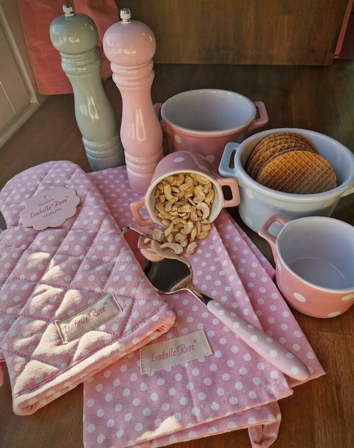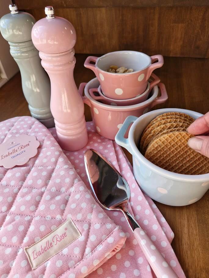 Isabelle Rose-tuotteet on suunniteltu ja tehty tuomaan iloa ja piristystä kotiin. Tuotteet ovat värikkäitä ja täynnä elämää joka suunnalta katsottuna! Materiaalit ovat korkealuokkaisia ja tuotteet kestävät aikaa. Valikoimista löytyy keittiötavaraa pyyhkeistä patakintaisiin sekä astioista talousvaakoihin ja leivontavälineisiin. Myös Huuhaa-nettipuodista saatavat näyttävät metallikylttitaulut löytyvät tämän firman varastosta.
